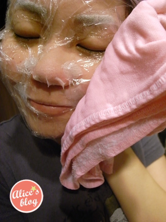 敷上面膜-->蓋上保鮮膜-->(在鼻孔戳兩個呼吸孔....這我自己加的步驟~XD)-->以溫熱毛巾覆蓋臉部