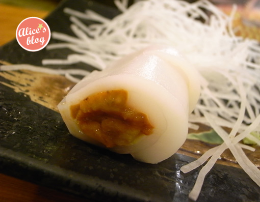 不下於紅魽肚的一道軟絲捲馬糞海膽:兩樣品質都超棒,配合在一起嘴巴都是甜味,好久沒吃好吃的海膽囉~~