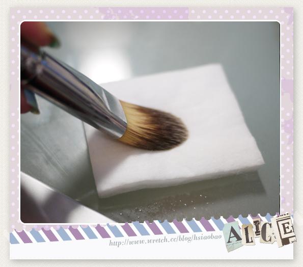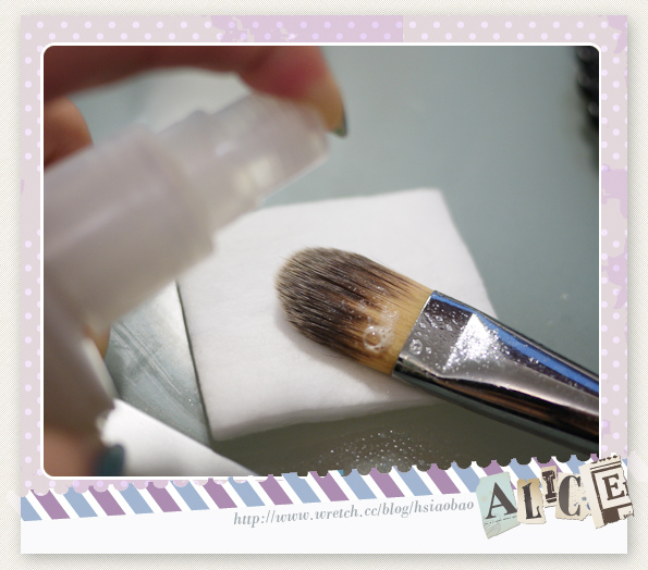 將刷具在浸濕過刷具清潔液的化妝棉上來回擦拭