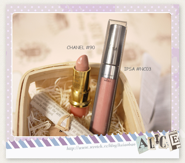 想呈現裸唇妝感的唇彩,使用了CHANEL #90 +IPSA #NC03