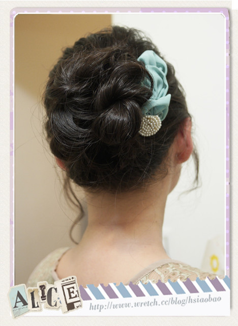 先綁個小馬尾,再將馬尾分段彎曲放置不同位置