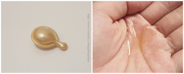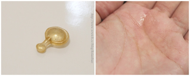 剪開以後呢~是比較水感一些的精華液唷!我想使用在眼週的商品還是清爽些比較舒適呢!
