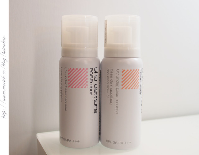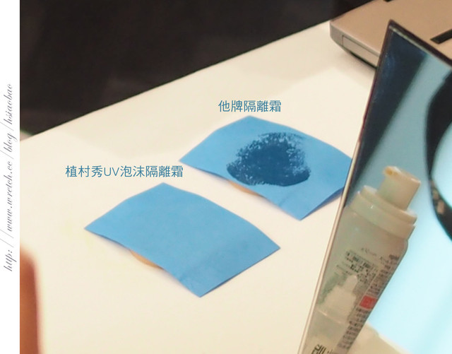 再擦上植村秀UV泡沫隔離霜-毛孔隱形配方與他牌隔離霜互相比較
