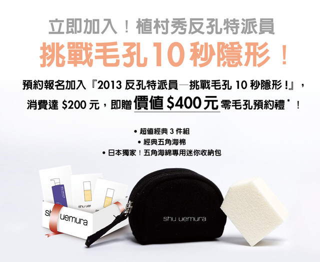 凡預約報名加入『2013反孔特派員,挑戰毛孔10秒隱形!』,消費達$200元