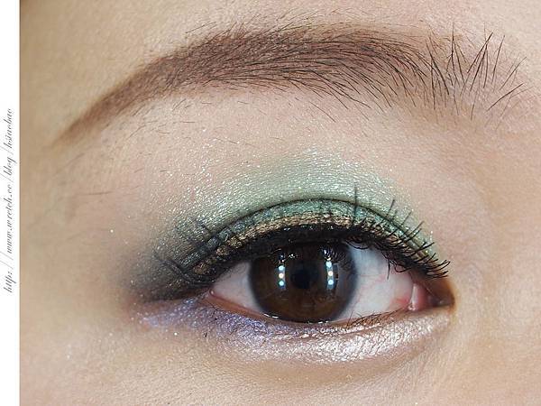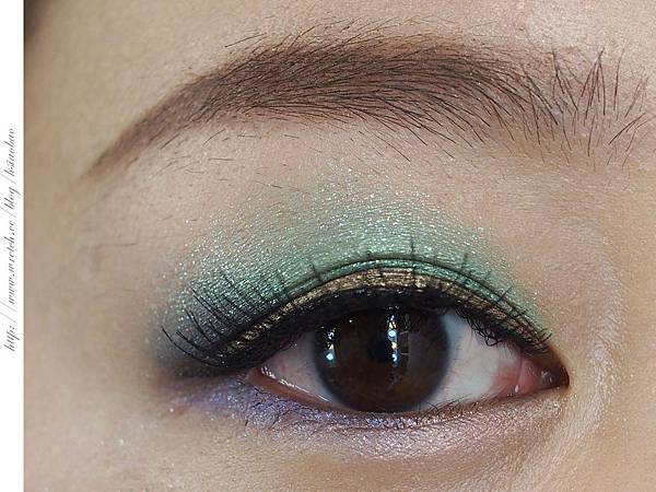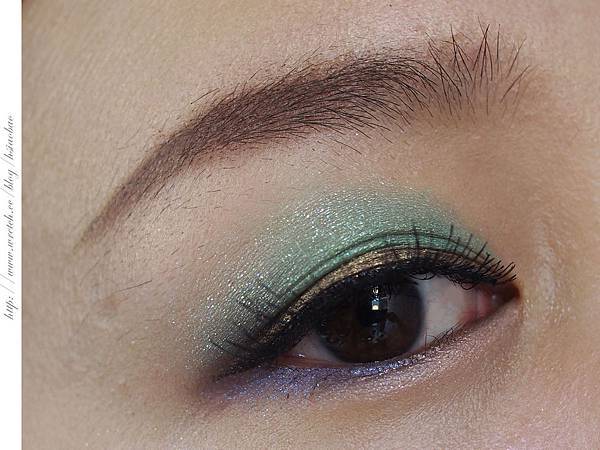 下眼影則以右上的藍色輕輕刷過,讓眼妝更加完整