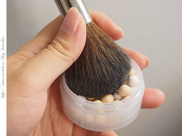 我使用蜜粉刷繞圈圈均勻沾染三色蜜粉球再刷到臉上