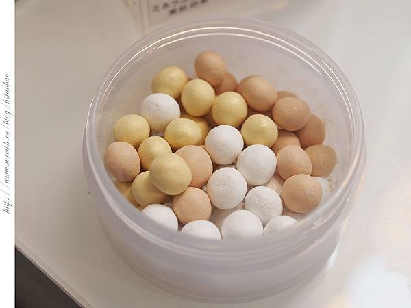 蜜粉球內有三個顏色:珍珠白、嫩膚色、香檳金