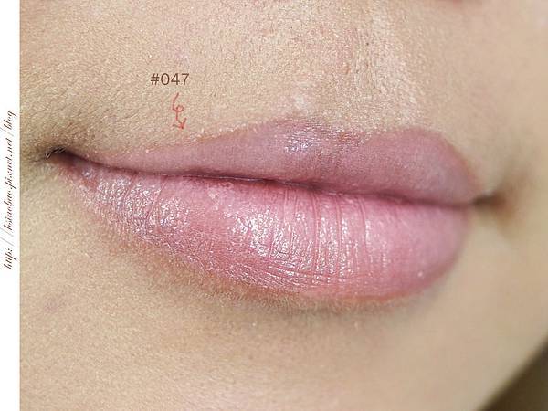 #047打底在唇部後,輕輕點上一點#063在唇中央