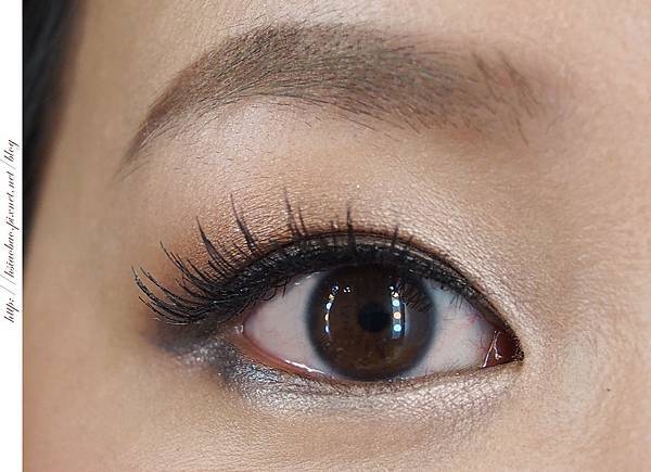 ★深咖啡色刷在眼線以及眼尾後方三角形區的位置,稍稍往上暈染模糊界線