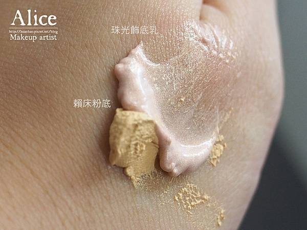 把手邊的珠光飾底乳一起調入粉底液中吧~