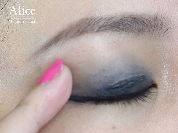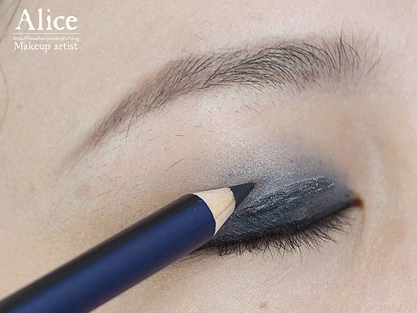 略有珠光的銀灰色眼影拿來與深藍色疊擦出漸層