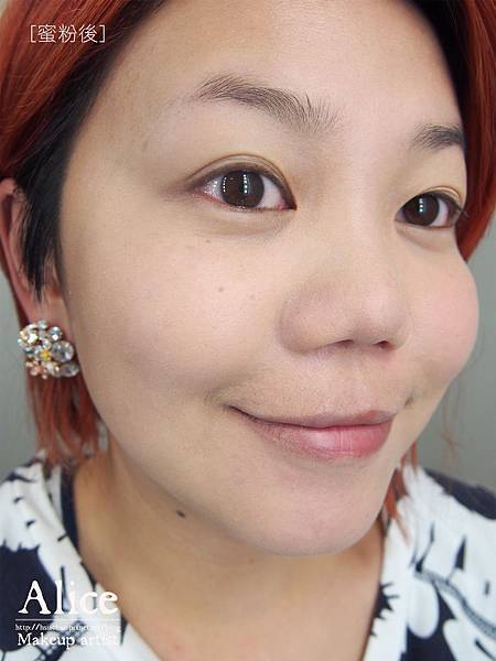 壓完蜜粉之後膚色略偏白了點,且呈現輕薄的粉霧妝感