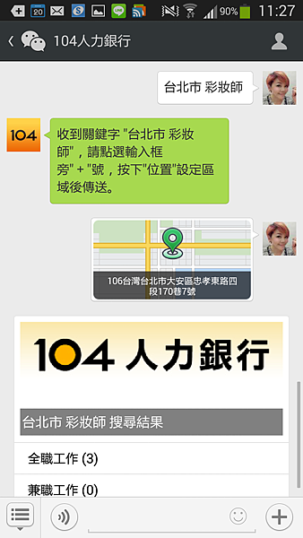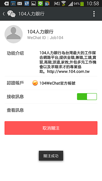 這樣一來在WeChat中就會接收到104人力銀行的最新訊息以及相關服務