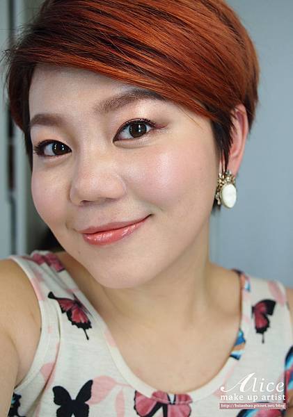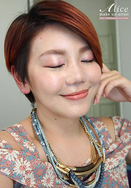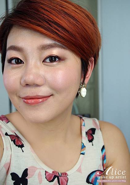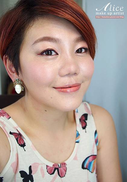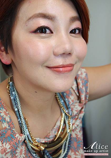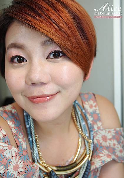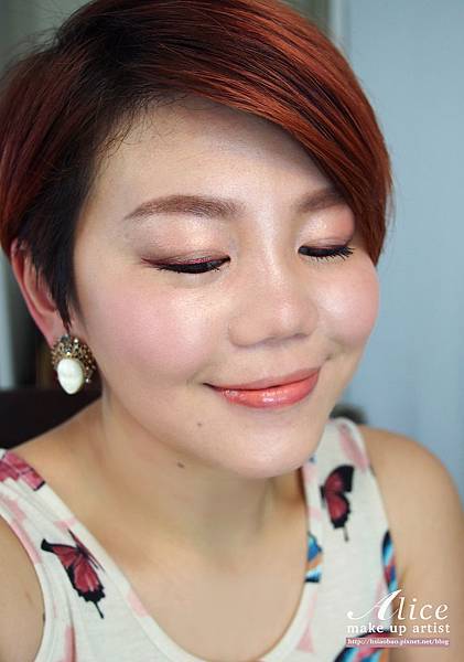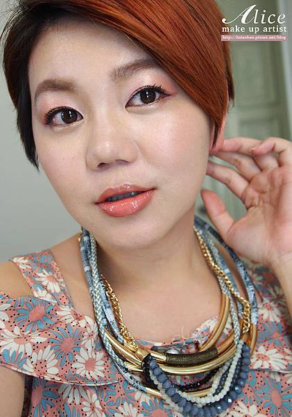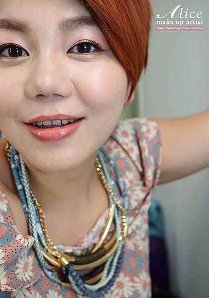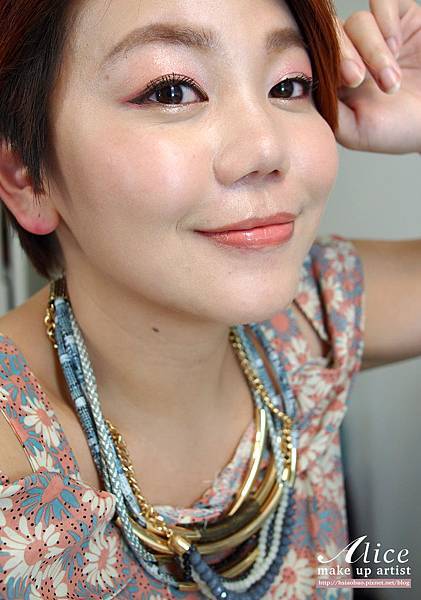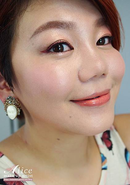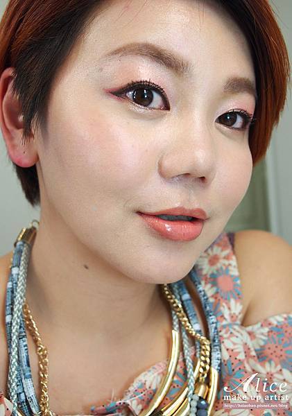 主題→以粉橘色為主角,配合眼尾咖啡色小煙熏,鮮亮紅色眼線點綴