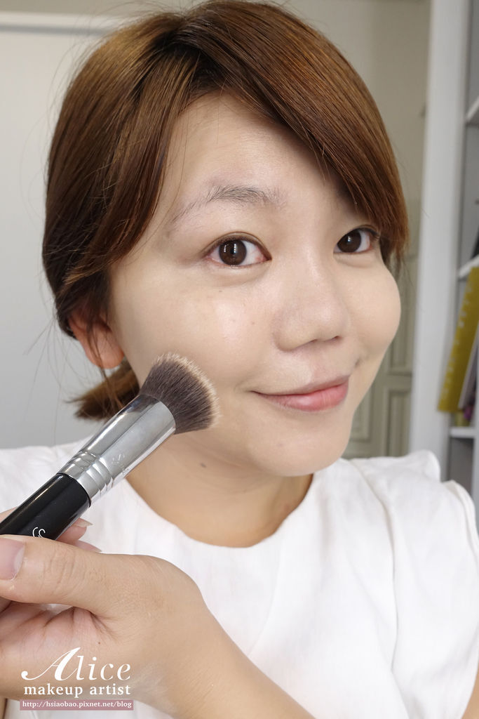 接著用紮實圓頭的粉底刷延展後輕輕拍彈