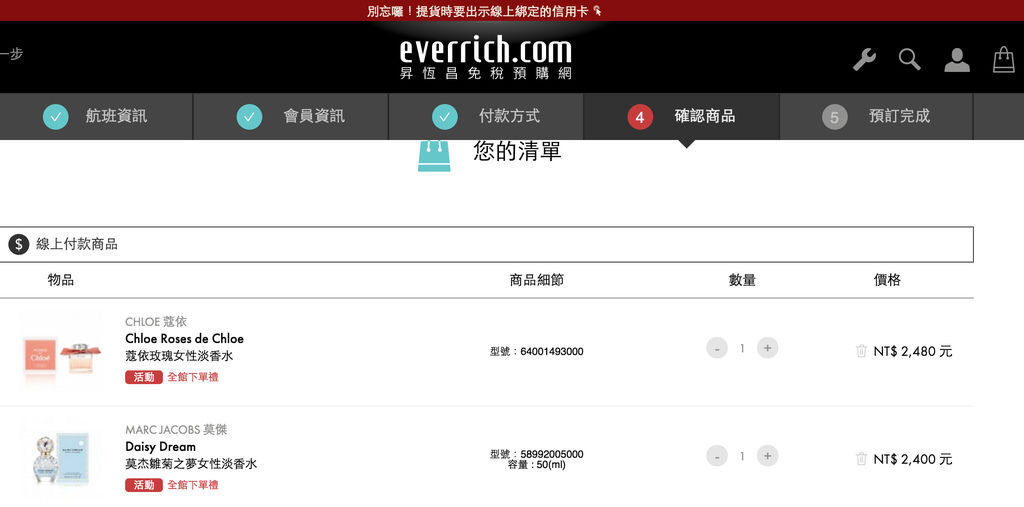 輸入自己的資料與班機資料之後,進行確認商品與結帳,